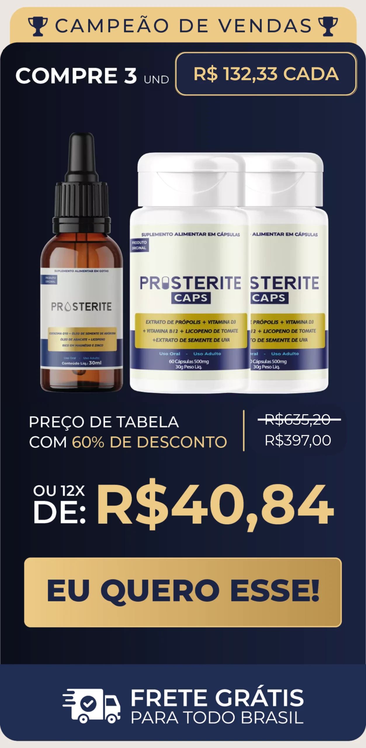 O tratamento Prosterite é único porque combina o melhor da natureza e da ciência em dois formatos complementares: as Gotas e as Cápsulas. Essa combinação potencializa a eficácia do tratamento, garantindo resultados mais rápidos e duradouros para quem busca alívio de sintomas e proteção contra problemas prostáticos.